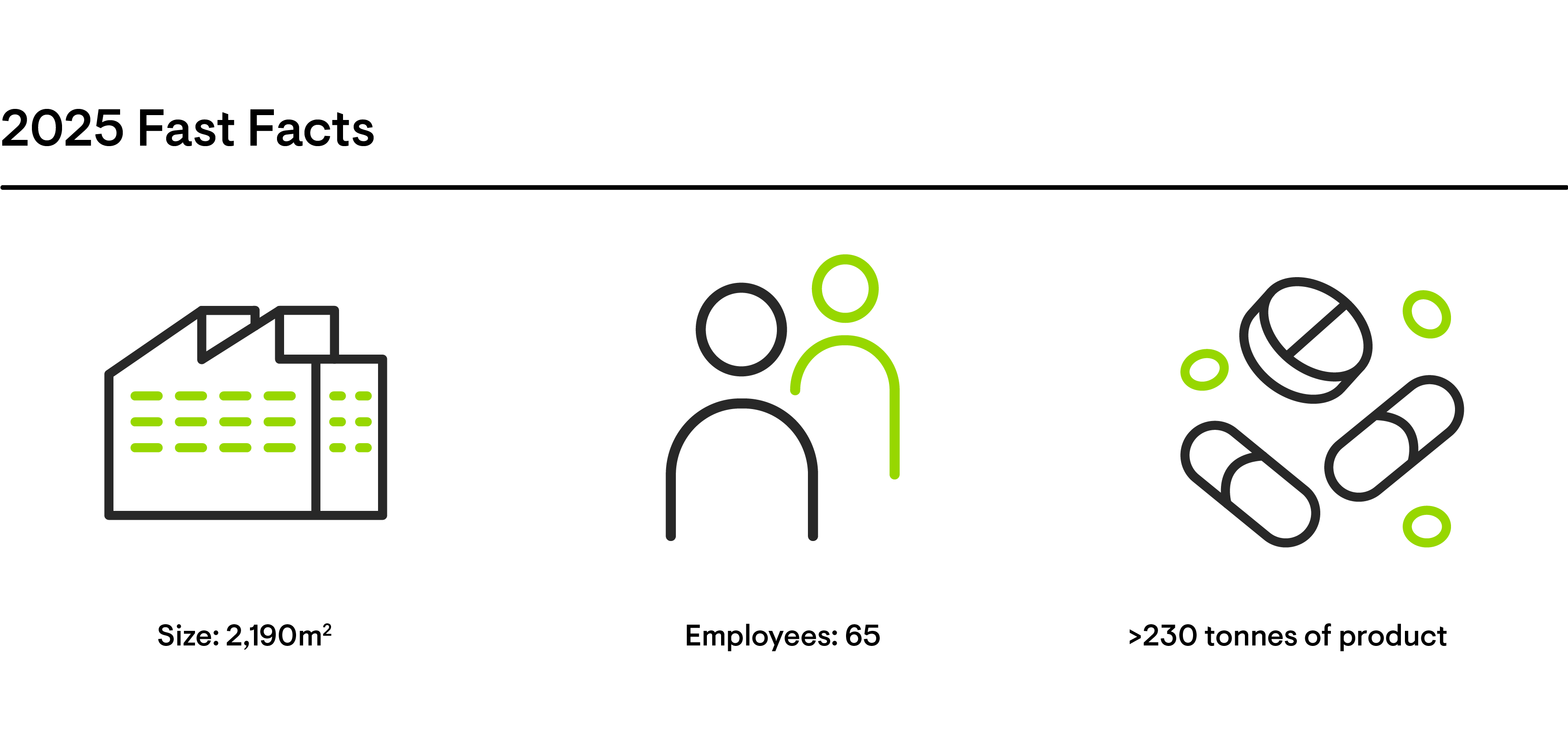 Our two API production sites in Europe ensured a reliable supply of key active pharmaceutical ingredients for Grünenthal and external partners. In 2025, the site focused on technical transfers, ramping up new APIs, and industrializing Rosuvastatin. Sustainability efforts advanced with the installation of heat pumps in Mitlödi, delivering CO2-free thermal energy powered by electricity from 100% hydropower.